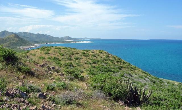 | View from the southern hill on the property. Note the reef structures paralleling the coast. These reefs offer wonderful snorkeling right from the beach. Throughout the year the beach sand moves with the currents and winds lifting and depositing sand parcels along the shoreline. In the near distance is Las Barracas. |