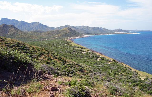 | Vista from the ridge after a late summer rain. The desert landscape seems to grow and turn green right before your eyes! Wildflowers, verdant foliage and butterflies will appear for a few days to several weeks after a good soak. In the far distance is Punta Arena extending eastward into the Sea of Cortez. The sandy point in the near distance is Las Barracas. |
